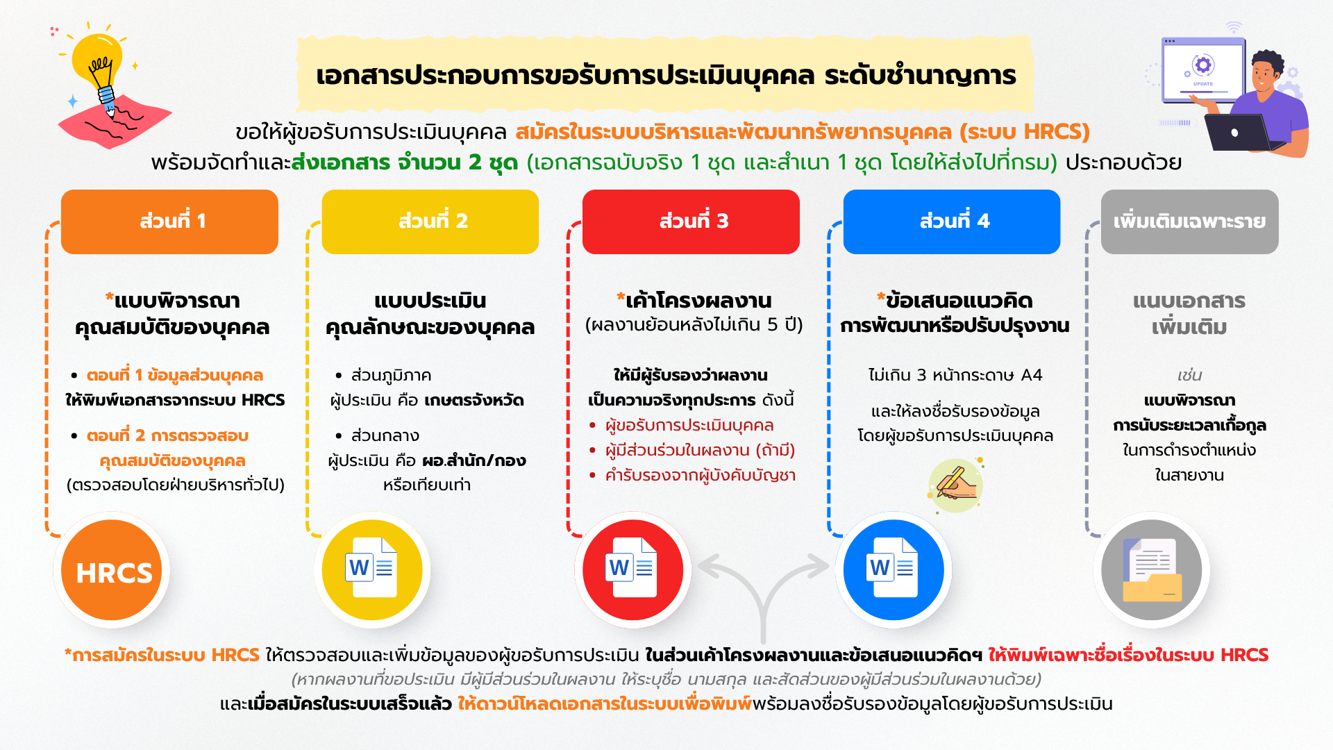 พร้อมจัดทำเอกสารประกอบการประเมินบุคคลเพื่อขอให้หน่วยงานรวบรวมส่งเอกสารประกอบการประเมินบุคคล จำนวน 2 ชุด (เอกสารฉบับจริง 1 ชุด และสำเนา 1 ชุด)